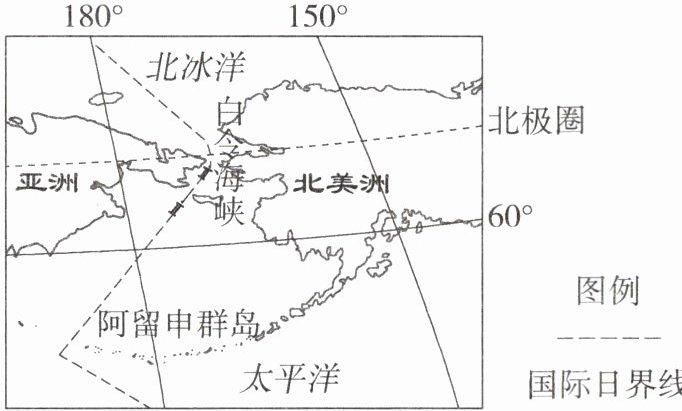 「2025河南洛阳期中」白令海峡的名字来自丹麦探险家维他斯·白令,他于1728年穿过白令海峡。下图为白令海峡周边区域示意图。据此完成3—4题。