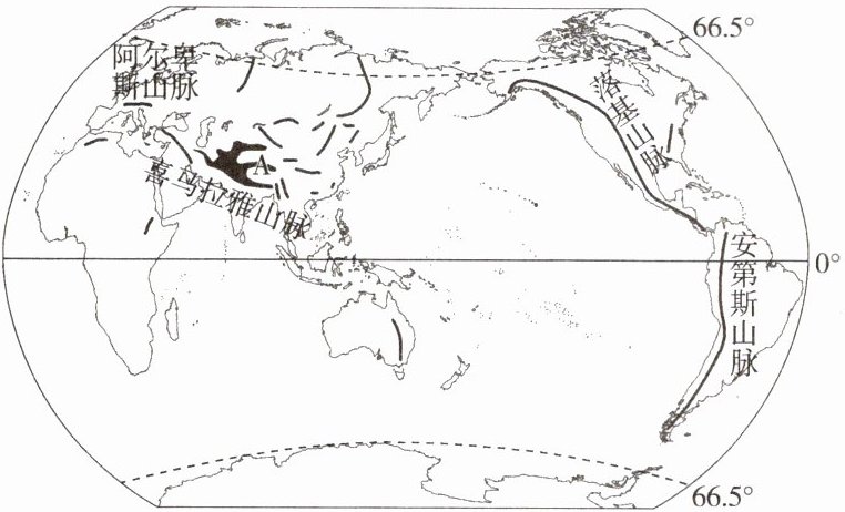 「2025江苏扬州宝应期末」地球表面高低起伏,地表形态复杂。读世界主要山脉分布图,完成8—10题。