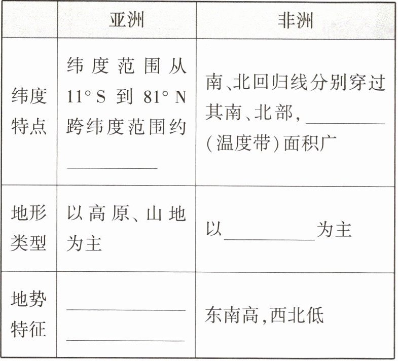 | 纬度特点 | 纬度范围从11°S到81°N跨纬度范围约______ | 南、北回归线分别穿过其南、北部,______(温度带)面积广 |