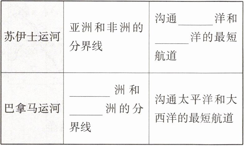 | 苏伊士运河 | 亚洲和非洲的分界线 | 沟通______洋和______洋的最短航道 |