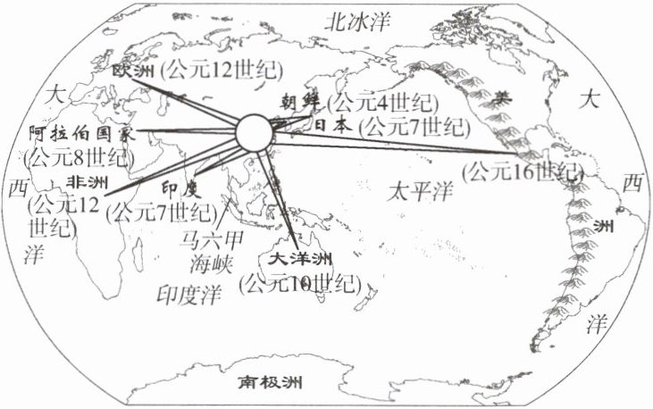 造纸术作为我国古代的四大发明之一,至今已有2000多年的历史。造纸术以我国为中心向世界各地传播,对世界文明的传播与发展有着重要的作用。下图示意造纸术传播路线。