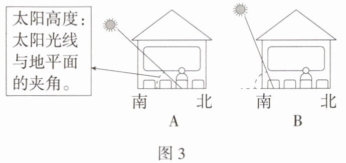 (4)A代表冬季,B代表夏季。正午时刻太阳高度越大,日影越短;太阳高度越小,日影越长。