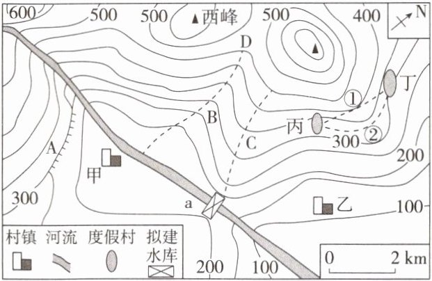(4) 当地振兴开发过程中,想整合旅游资源,改善交通,计划在丙和丁两个度假村之间修建一条旅游观光公路。从坡度陡缓来看,线路①②中坡度相对和缓的是______;你认为 A 处可因地制宜开发的旅游项目有哪些? (4 分)