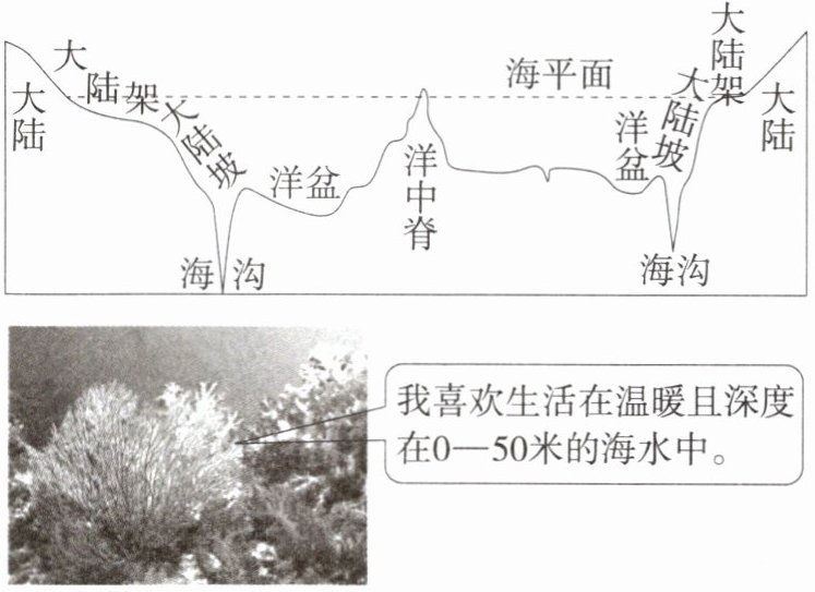 当主人公钻出“鹦鹉螺”号潜入水中,看到这里生长了很多异常美丽、形态各异的珊瑚。下图示意海底地形分布和珊瑚生长习性。
