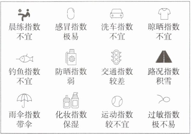 2.B 图示除了风力符号和气温,还有昨天天气符号为阴、今天为霾、明天和星期四为小雪、星期五和星期六为多云(此处原参考答案“明天和星期四为小雪”可能与实际图中信息有关,按原文保留)、星期日为小雪、星期一为晴。因此,图中所示时间段出现天气符号有小雪、霾、多云、风、阴,B正确。3.C 结合两幅图分析可知,11月28日为小雪,不宜外出且防晒指数弱;由于路况指数为积雪,交通指数较差,开车需注意路面湿滑;11月28日气温为$-13^{\circ }C$—$-7^{\circ }C$,气温低,极易感冒;该日过敏指数为"极不易"。