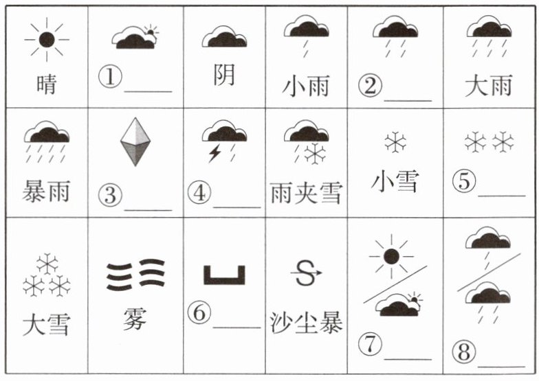 4.B A表示霜冻,C表示沙尘暴,D表示台风,不符合"回南天"发生时的天气状况;B表示雾,"回南天"发生时空气湿度加大,易出现大雾。5.C "回南天"发生时空气湿度大,使用除湿机是正确的做法;取暖器可用来提高温度,与湿度关系不大;加湿器不仅不能降低空气湿度,反而增加空气湿度;"回南天"发生时室内外空气湿度都比较大(此处原参考答案表述保留),电风扇只能起局部短时间增强蒸发的作用,并不能大面积除湿。