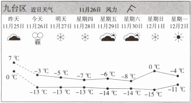 [2025吉林长春九台期末]天气影响人们的生产和生活,下图为九台区2024年某一时间段的天气预报图及11月28日生活指数图。结合图示内容完成2—3题。