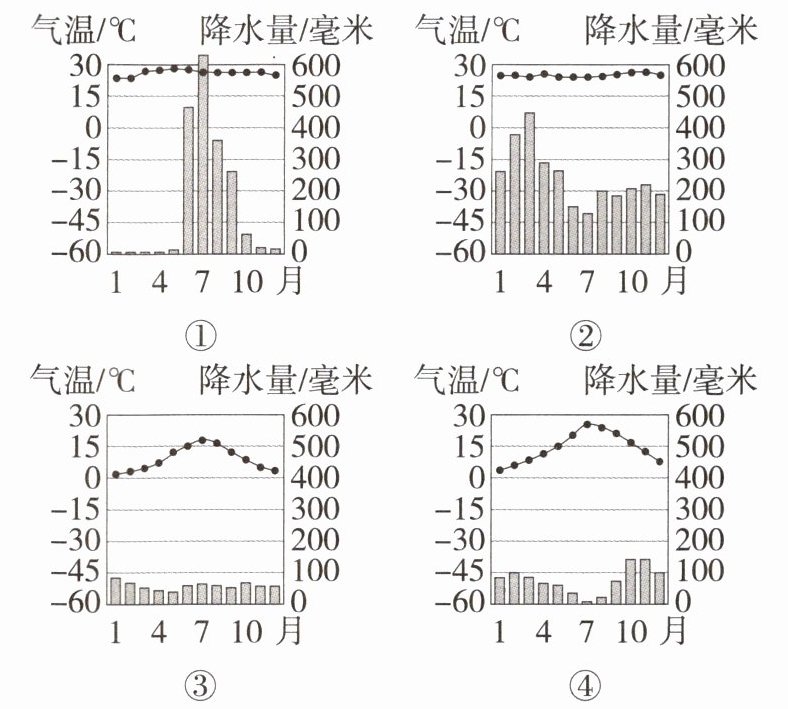 10.C ①是全年高温、分旱雨两季的热带季风气候;②是全年高温多雨的热带雨林气候;③是全年温和湿润的温带海洋性气候,全年降水均匀;④是夏季炎热干燥、冬季温和多雨的地中海气候。11.D 根据材料可知,油橄榄主要分布于地中海沿岸国家,这些地区大部分属于地中海气候,所以适合种植油橄榄的是④地中海气候。12.C 由上题可知,油橄榄适合种植在地中海沿岸地区,该地区最高气温出现在7月份,可以判断出该地区位于北半球。
