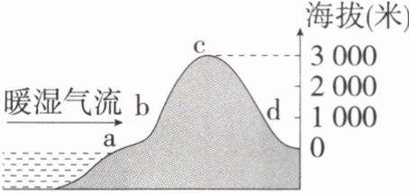 5.D 地形是影响气候的重要因素,随着海拔的增高,气温降低。一般情况下,海拔每升高100米,气温约下降0.6℃。若d地温度为16℃,此时c地温度理论值为:16℃-(3000-1000)÷100×0.6℃=4℃,D正确。6.D 图中a、b、c位于暖湿气流的迎风坡,降水多;d位于背风坡,盛行下沉气流,降水最少。7.A 迎风坡降水多,背风坡降水少,影响该地区降水的主要因素是地形因素。