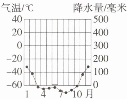 「2025广东潮州饶平期末」南极洲(Ant-arctica),位于地球南端,全洲无定居居民,只有来自世界各地的科学考察人员和捕鲸队。南极大陆是人类最后到达的大陆。右图为南极某地气温曲线和降水量柱状图。据此完成1—2题。
