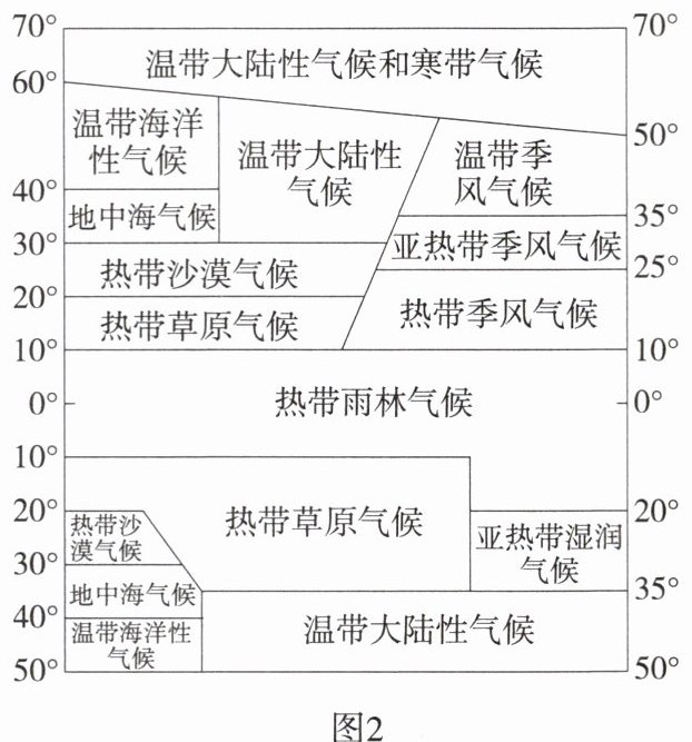 (2)读图2,写出图1中①②③所代表的气候类型名称:①______、②______、③______,其中③→①→②年降水量的变化特点是______。