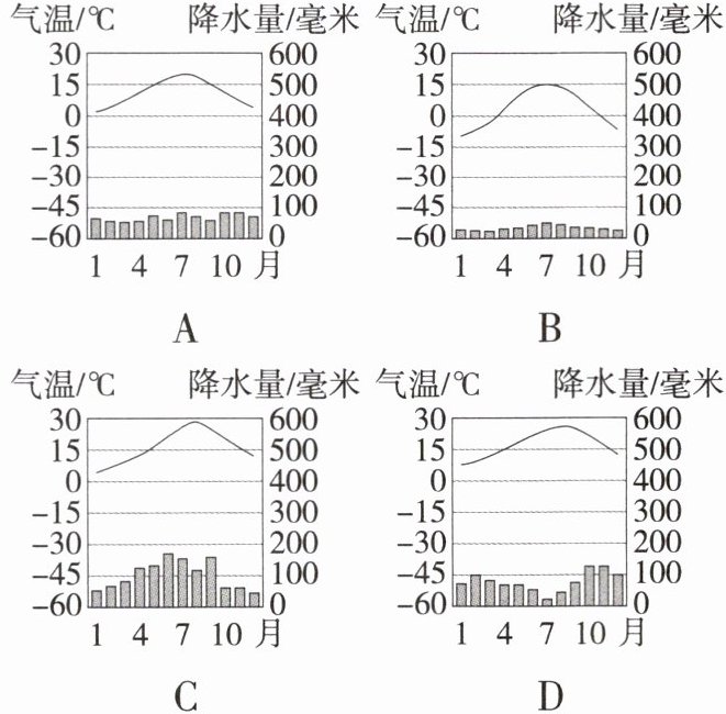 (3)图1中④对应的气温曲线和降水量柱状图是______(单项选择),描述④所在地区的气候特征:______。