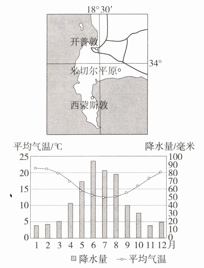 「2024湖南长沙浏阳期末」开普敦市被称为“南非明珠”,是南非的第二大城市,位于开普半岛北端的狭长地带,西部濒临大西洋桌湾,其宁静美丽可与旧金山相媲美,被欧洲游客誉为“冬季避寒胜地”。读开普敦市位置及其气候资料示意图,完成13—14题。