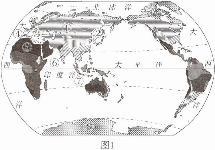 (1)世界气候类型分布的一般规律是从低纬到高纬大致可以划分为热带、亚热带、______和寒带四种气候类型。图1中①~⑧属于热带的气候类型有______(填序号),从纬度范围看,主要分布在______之间。属于寒带的气候类型有______(填序号),主要分布在南、北极圈以内。
