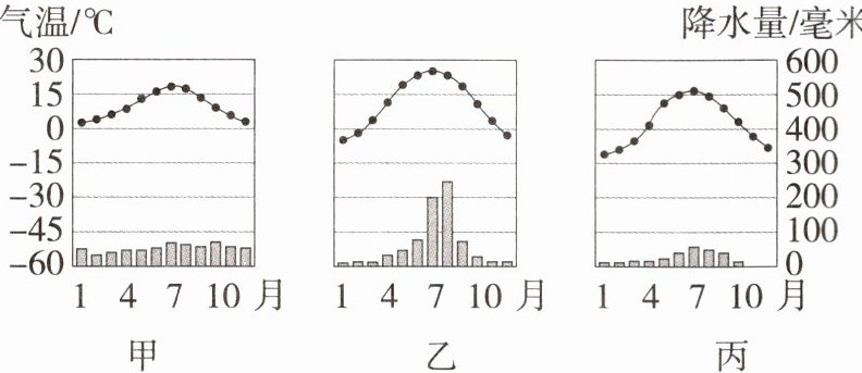 读亚欧大陆温带气候类型分布图和亚欧大陆中纬度甲、乙、丙三地气温曲线和降水量柱状图,完成11—12题。