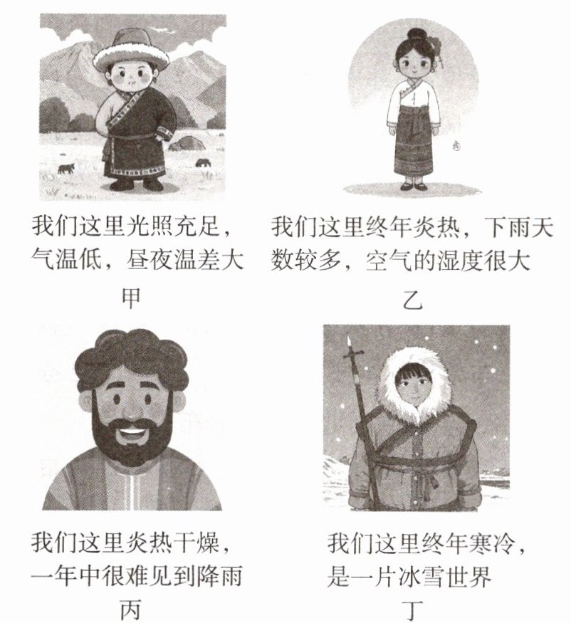[2025 河北唐山期末]根据世界气候类型分布图、四位朋友的穿着和对家乡气候的描述,完成 13—15 题。