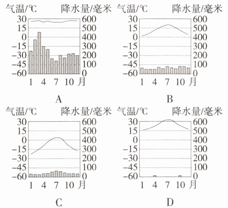 15.下列各气温曲线和降水量柱状图表示的气候类型,与丙朋友的描述相符的是 ( )