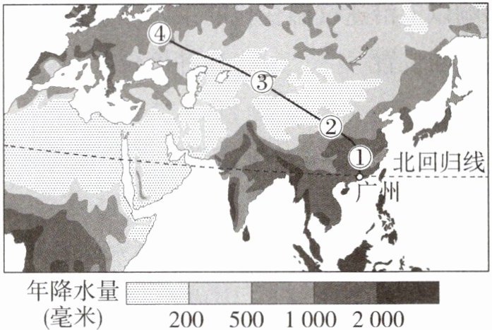 [2025 河北邢台信都月考]2024 年 1 月 16 日,“广州—汉堡”中欧班列顺利开行,为高质量建设“一带一路”注入强大动能。下图为世界局部年降水量图。据此完成 8—10 题。