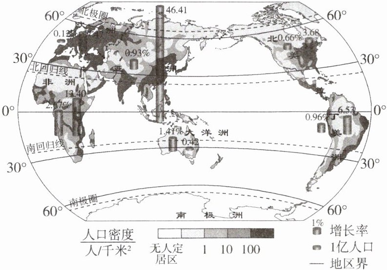 1.D 如图所示,非洲人口增长速度最快;亚洲人口数量最多;南极洲是无常住人口的大洲;世界人口的地理分布很不均匀,有的地方稠密,有的地方稀疏。
