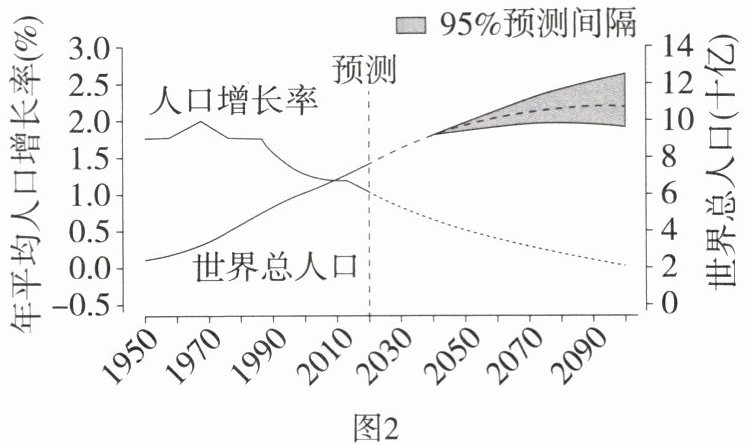 (4)据图2可知,年平均人口增长率约在____年达到峰值,2020年以后预测世界人口的增长将____(加快/趋缓)。