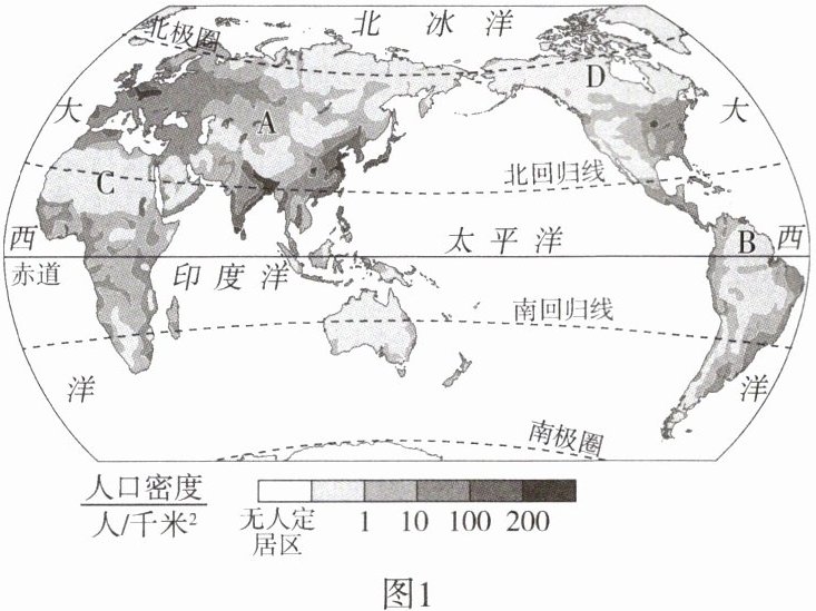 (1)图1中A地区的人口密度约为____,B地区人口密度约为____。