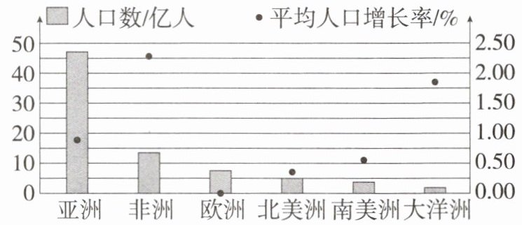 「2025广东广州白云期末」2024年7月11日是第35个世界人口日。为了解世界人口的增长和分布情况,小红同学收集了世界各大洲人口数(2021年)及平均人口增长率(2015—2019年)统计图(下图)。完成7—8题。