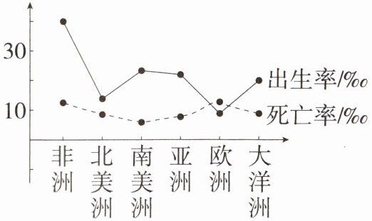 读大洲人口出生率和死亡率示意图(南极洲除外),完成5—6题。