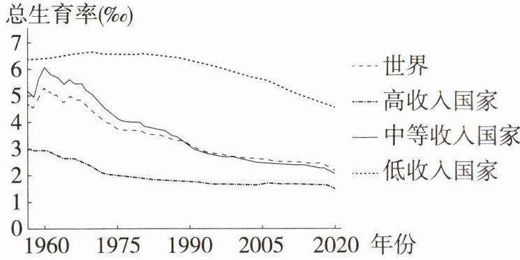 「2024湖南长沙浏阳期末」总生育率是一个时期生育水平的度量指标,人口学界通常将总生育率低于1.3‰称为“极低生育率”,不利于人口更替、再生产和未来发展。下图为1960年到2020年不同收入水平国家的总生育率,据此完成3—4题。