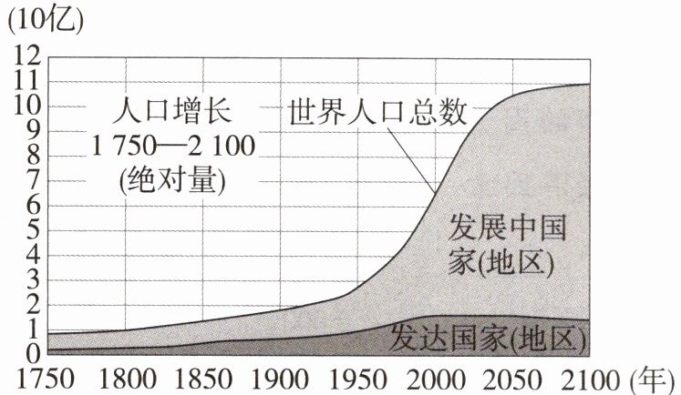 1.B 读图可知,在1750—2000年,世界人口的增速越来越快。2.D 据图可知,发达国家(地区)的人口增长慢,将会出现:国防兵源不足、劳动力不足、社会养老负担加重等人口老龄化问题。