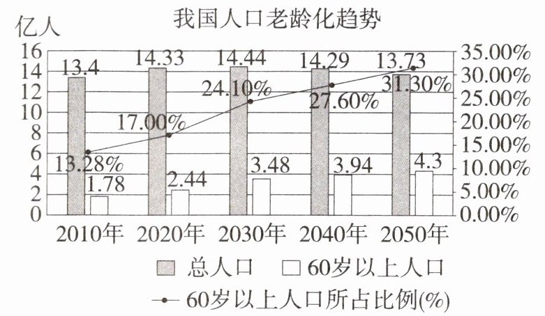 18.A 由图可知,我国人口从2010年到2050年,60岁以上人口数量åæå çæ¯ä¾æç»å¢é¿ï¼å¾ä¸æ¾ç¤ºï¼2030年以åæå½äººå£æ»æ°å¼å§ä¸éï¼å¾ä¸æ¾ç¤ºï¼å¨2020å¹´ï¼60å²ä»¥ä¸äººå£æå çæ¯ä¾æ²¡æè¶