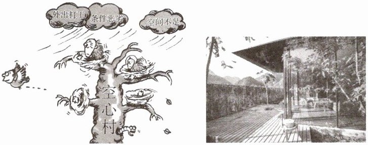 「2025河南驻马店泌阳期末」“空心村”是指随着我国城市化进程加快,大量农村青壮年涌入城市打工,农村常住人口流失的现象。河北省保定市涞水县南峪村通过旅游改革发展将昔日“空心村”的闲置老屋变身“网红民宿”,吸引大量青年回乡发展。读“空心村”示意图和南峪村民宿图,完成13—14题。
