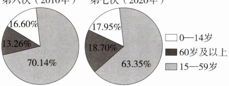 「2023 湖北宜昌中考」下图为我国第六次、第七次全国人口普查年龄结构图,2010 年我国总人口为 13.40 亿,2020 年为 14.12 亿(注:数据不包括港澳台居民)。据此完成 9—10 题。