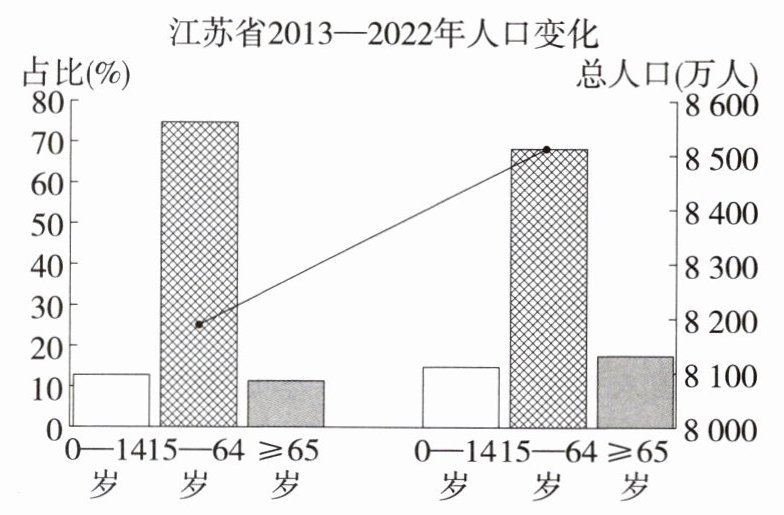 「2024 江苏苏州中考」江苏省位于我国人口密集区,下图为江苏省 2013、2022 年人口年龄结构和人口总量统计图,据此回答 7—8 题。