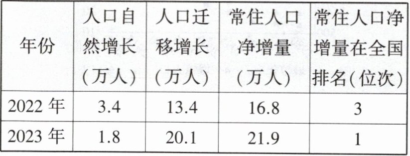 「2024 安徽中考」2023 年末,安徽省省会合肥市常住人口达 985.3 万人,其中城区人口突破 500 万人。科技崛起激发经济活力,人民生活水平不断提升,合肥市已跨入特大城市之列。下表为合肥市 2022 年和 2023 年人口增长状况。据此完成 11—12 题。
