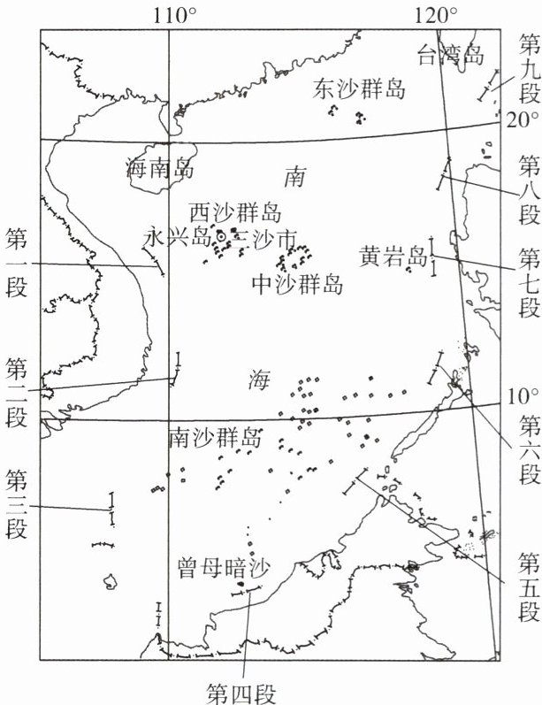 在中华人民共和国的海洋疆界中,有一组特殊的线段,即“南海断续线”和东海有关线段,属于我国主权范围。下图示意“南海断续线”。