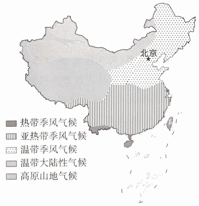5.B 结合所学知识,温带大陆性气候分布在我国西北地区;我国气候具有气候类型复杂多样、季风气候显著、大陆性气候强的特点,共有五种气候类型分布,并不是世界每种气候类型在我国都有分布。6.D 在我国,最适宜种植水稻的气候区为亚热带季风气候区与热带季风气候区,这些地区水热充足,是我国最重要的水稻产区。
