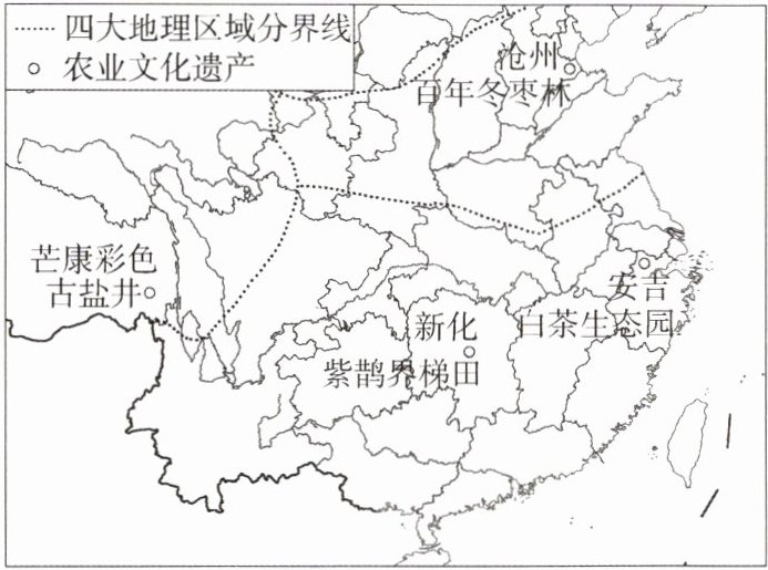 [2025云南红河期中]我国拥有丰富多样的文化遗产,下图示意部分农业文化遗产分布。读图完成1—2题。