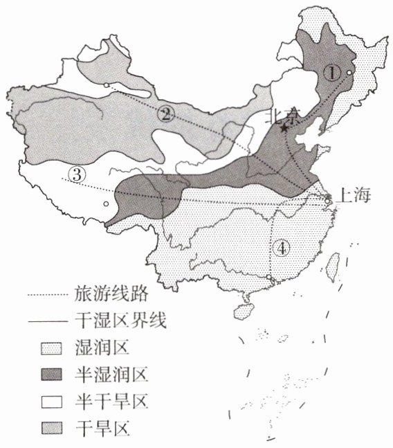 家住上海的小明为了在暑假期间游览祖国的大好河山,精心设计了四条游览线路,读图完成3—4题。