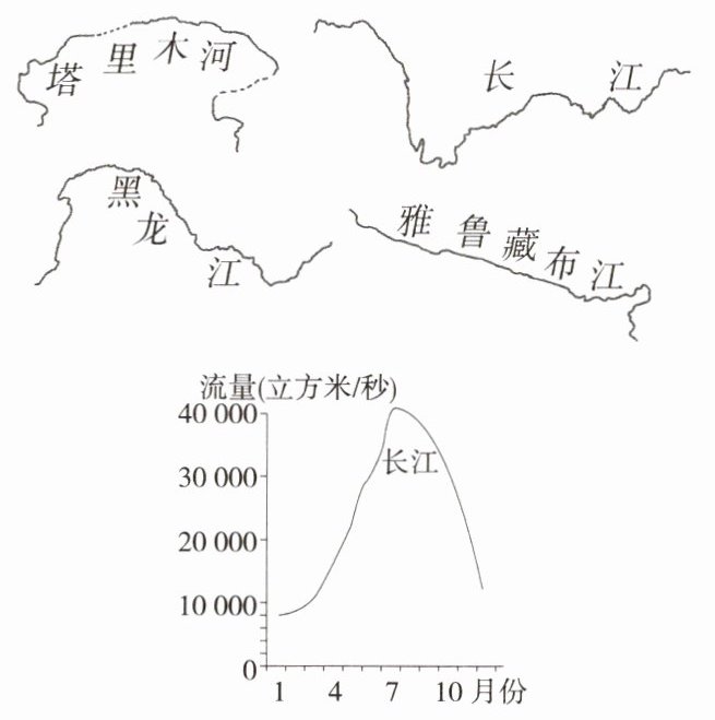 3.C 四条河流中,结冰期最长的是位于东北地区的黑龙江,纬度最高;塔里木河位于西北地区,长江位于南方地区,雅鲁藏布江位于青藏高原。4.B 塔里木河位于塔里木盆地,是我国最长的内流河;水源主要来源于高山冰雪融水;位于西北内陆地区,气候干旱,降水少,不适合大量种植需水量大的水稻。5.B 据长江流量年变化曲线示意图所示信息判断,该图看不出长江流量年际变化;长江最大流量可达40 000立方米/秒;长江流量是夏秋多,冬春少,季节变化大。