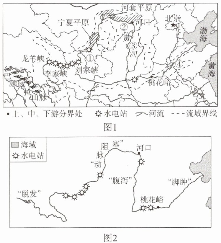 「2025广东湛江月考」2024年3月27日,黄河内蒙古河段最后封冻河段全线开通,标志着黄河平稳度过2023—2024年度凌汛期。图1是黄河水系略图,图2是黄河干流的病症示意图,据此完成12—14题。