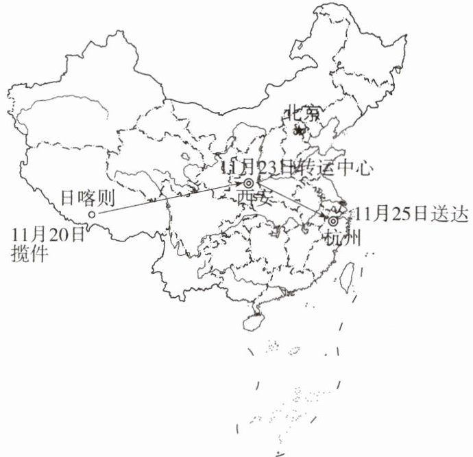 [2025河南平顶山期中]电商助力乡村振兴,网销促进农民增收。2024年11月20日,西藏自治区日喀则市南木林县艾玛乡村民旺布的手机收到了来自杭州市桐庐县芦茨村民宿老板王先生订购土豆的订单,11月25日,王先生收到了订购的土豆,下图为土豆运输时间及路线示意图。根据图文材料,结合所学完成7—9题。