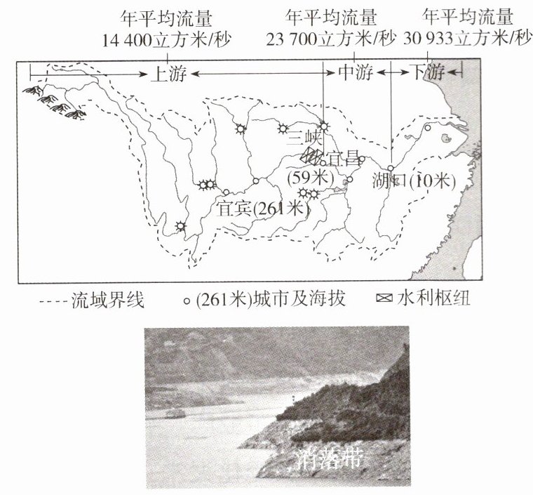 17.「2025山东泰安期中」长江不仅是中华民族的母亲河,也是令人叹为观止的生态宝藏。党的二十大报告提出“推动绿色发展,促进人与自然和谐共生”。下面为长江流域示意图和出露的消落带景观图。阅读图文材料,回答问题。