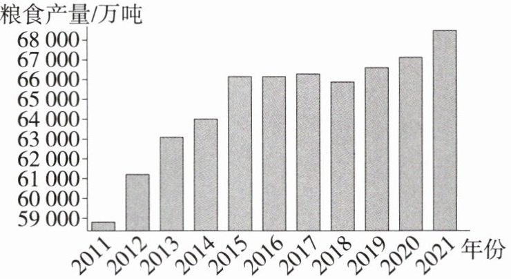 2024年12月17日至18日中央农村工作会议在北京举行,会议强调抓好粮食和重要农产品生产。读近年来我国粮食年产量图,完成1—2题。