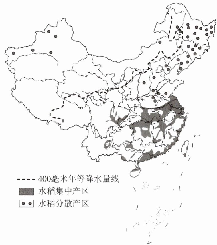 著名水稻专家袁隆平院士利用遗传工程技术选育出耐盐碱的海水稻。读中国水稻分布图,完成5—6题。