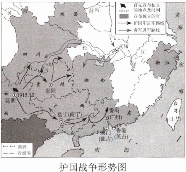 结合所学知识可知,1915年底,蔡锷、李烈钧、唐继尧在云南宣告独立,组织护国军北上讨袁,护国战争爆发。在各方讨伐下,1916年3月,袁世凯被迫宣布取消帝制。