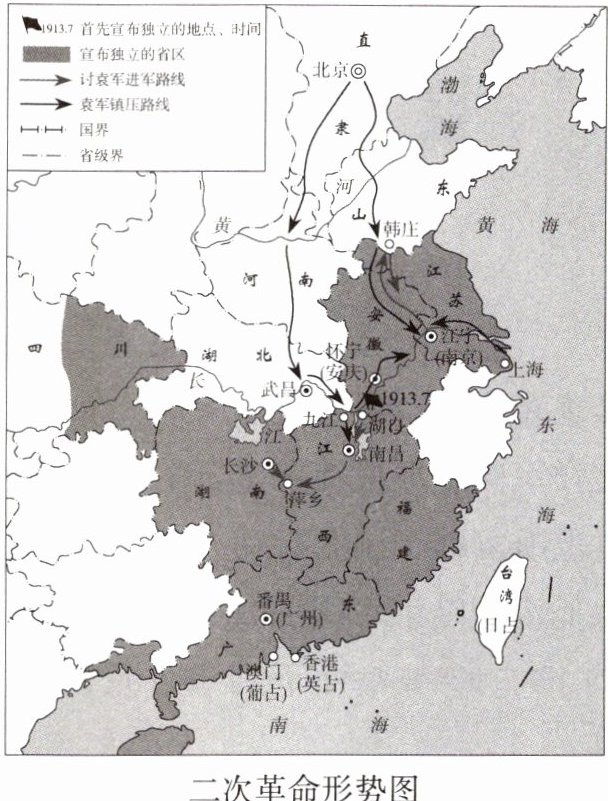 以孙中山为首的革命党人,为维护共和制度进行了不懈斗争,主要包括二次革命、护国战争、护法运动等,D项正确;革命运动都从南到北席卷全国与史实不符,排除A项;二次革命、护国战争中宣布独立的省区不完全相同,排除B项;两次斗争都是反对袁世凯的倒行逆施,排除C项。故选D项。解题方法 政治地图类解题方法看地图名称,辨别地图类型;看图例,明确地图内容;看图中重要信息,迁移课本知识。政治类地图关注点如下:①形势图:根据主题,确定观察重点。②殖民扩张、领土扩张图:殖民者的殖民活动区域或侵占的领土。③疆域图:国家(政权)、重要的地方行政区及四周边界和范围。