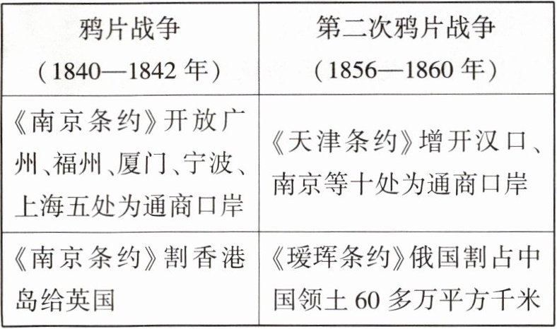 B 根据表格信息并结合所学可知,鸦片战争使中国开始沦为半殖民地半封建社会,第二次鸦片战争使中国的半殖民地化程度进一步加深。故选B项。