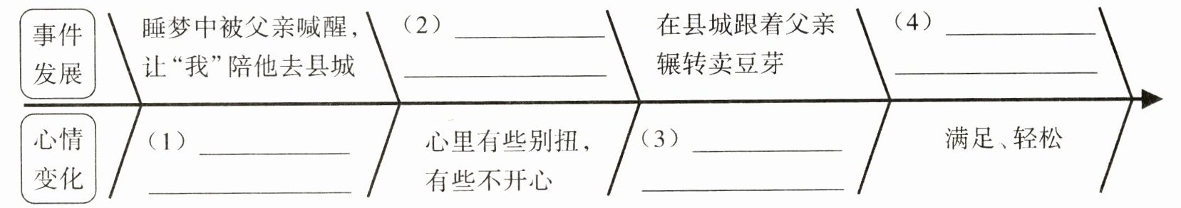 |事件发展|睡梦中被父亲喊醒,让“我”陪他去县城|(2)______|在县城跟着父亲辗转卖豆芽|(4)______|