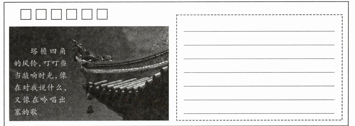 4. 小州设计了一张"丝路风铃"明信片,想寄给远方的友人。请你根据对第⑭段画线句的理解,写一首"出塞歌"(小诗),作为写在明信片上的寄语。(不少于4行)(5分)