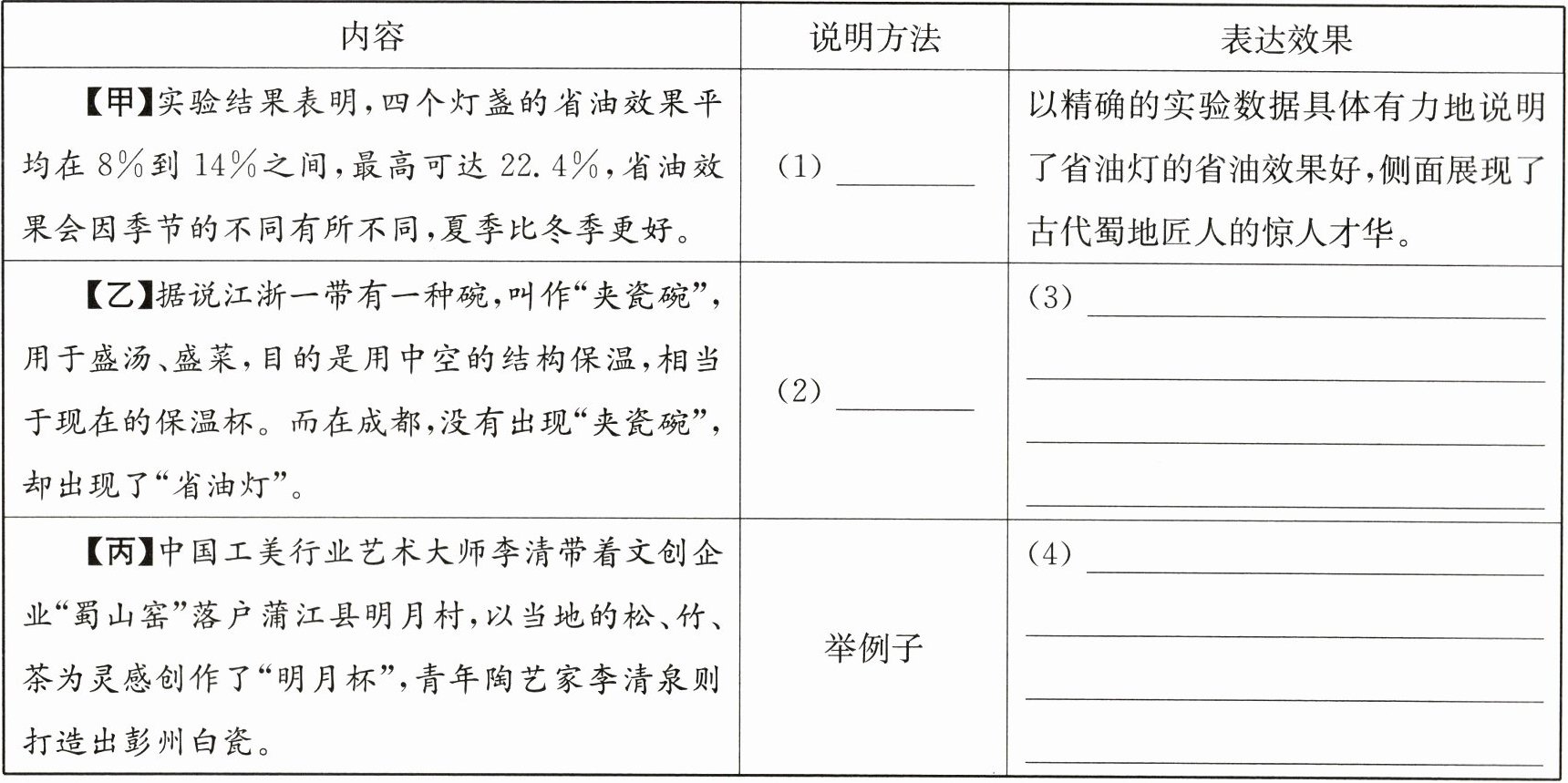 |【乙】据说江浙一带有一种碗,叫作“夹瓷碗”,用于盛汤、盛菜,目的是用中空的结构保温,相当于现在的保温杯。而在成都,没有出现“夹瓷碗”,却出现了“省油灯”。|(2)______(3)______|______ ______ ______ ______ ______ ______ ______ ______|